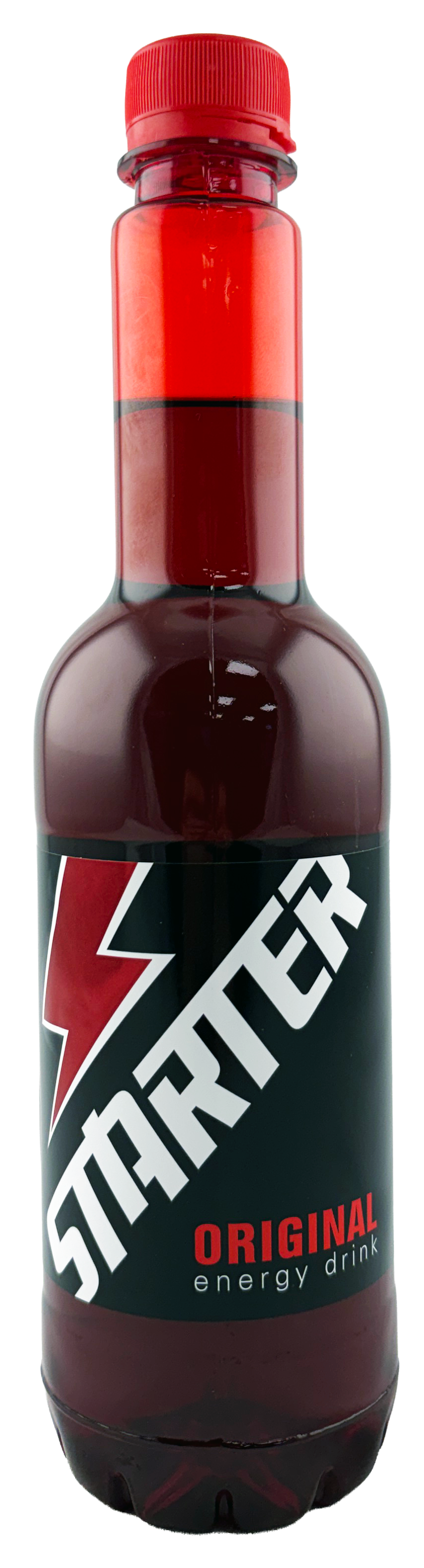 Energy drink. Starter is a non-alcoholic stimulating beverage with a slight cola flavour, containing taurine and caffeine. It is suitable for maintaining alertness during stressful work periods and while driving.